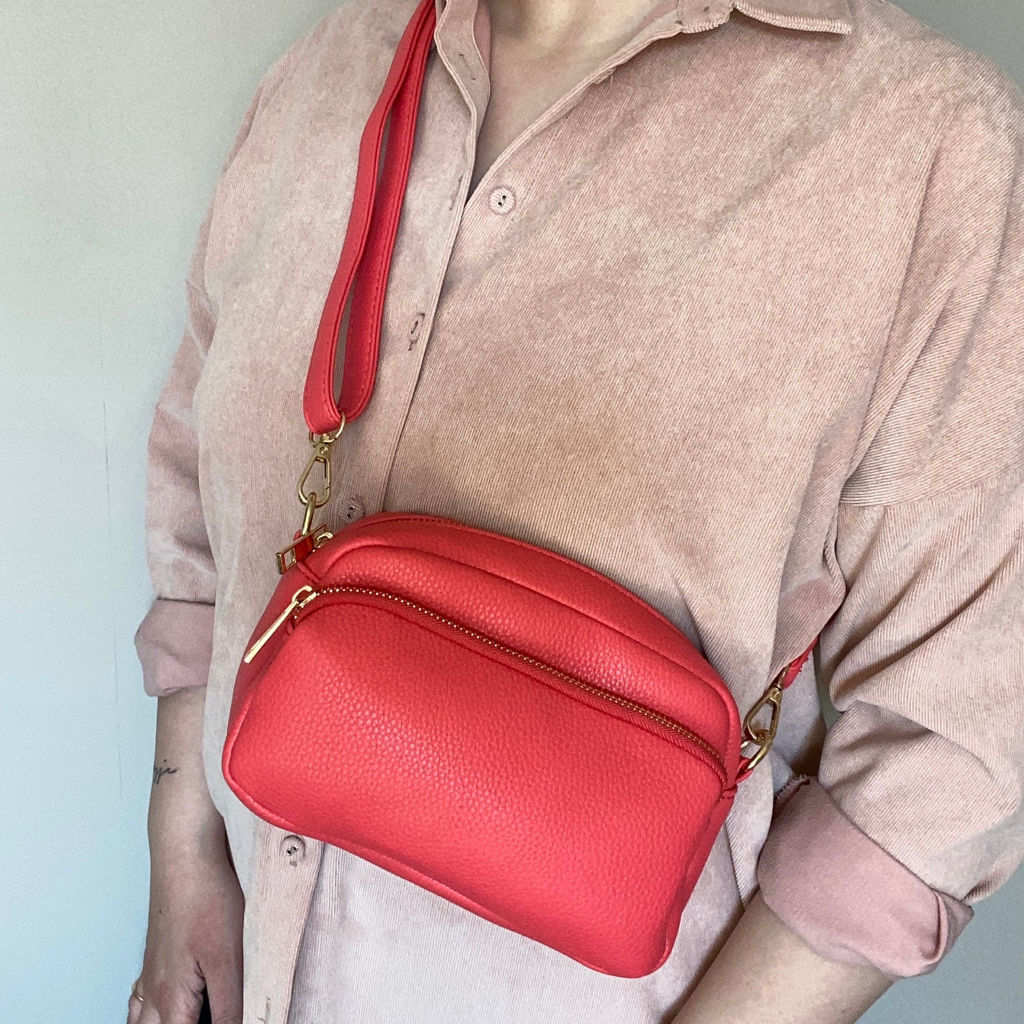 Deze trendy tas is niet alleen een eyecatcher, maar ook bijzonder praktisch. Het voorvakje met rits biedt extra opbergruimte voor je kleinere spullen, en de gouden hardware geeft de tas een luxe uitstraling. Het matte materiaal van vegan leer geeft de tas een moderne look die bij elke outfit past.
